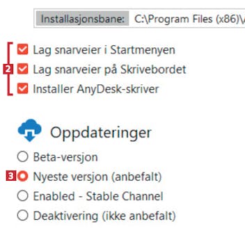 Først laster du ned AnyDesk fra nettsiden vår og kjører installasjonsfilen. Da åpnes dette vinduet. Klikk på Installer AnyDesk på denne datamaskinen …1.