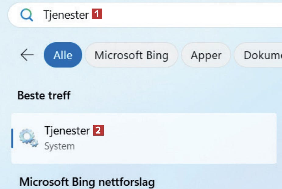 Klikk på startknappen. Søk etter Tjenester 1. Velg Tjenester 2.