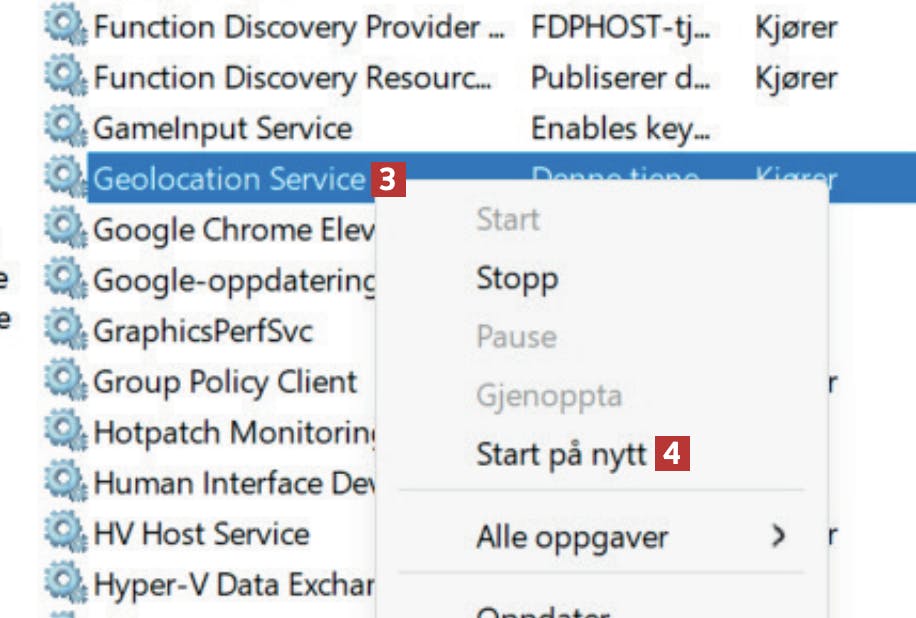 Finn og høyreklikk på Geolocation Service 3. Deretter velger du Start på nytt 4.