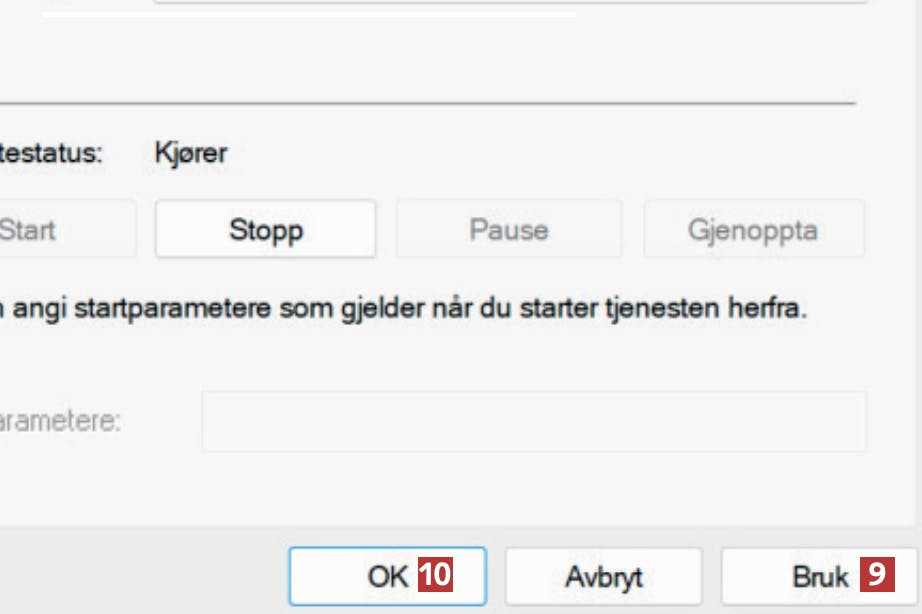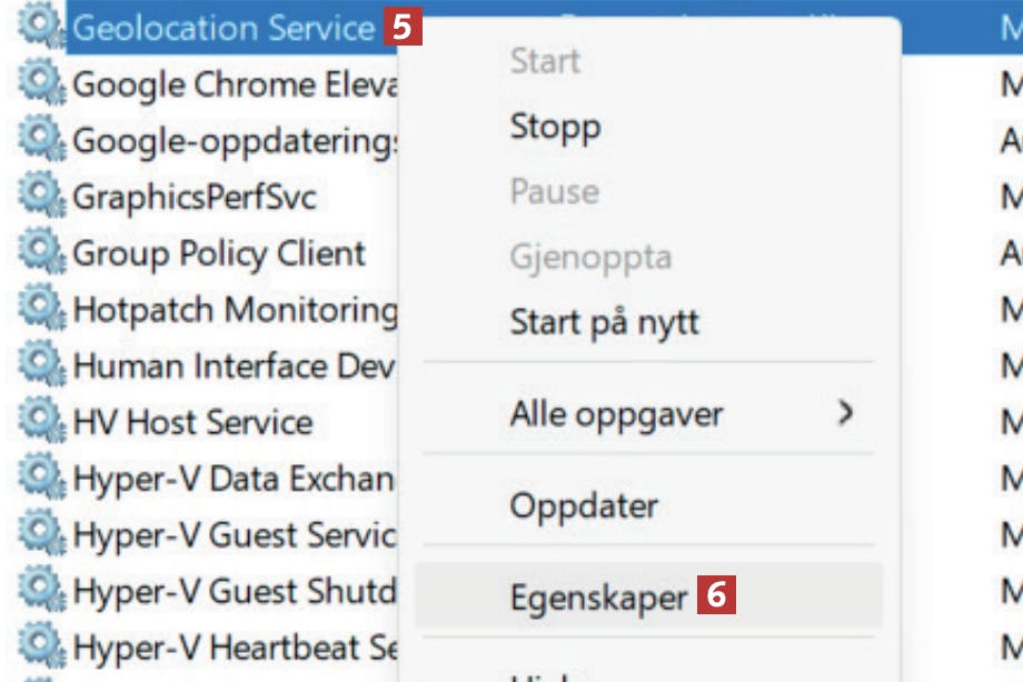 Når tjenesten har startet på nytt, høyreklikker du på den igjen 5 og velger Egenskaper 6.