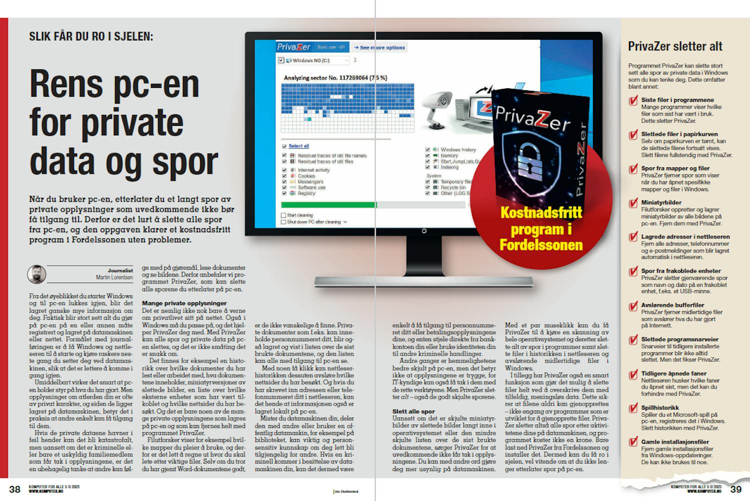 I tillegg har PrivaZer også en smart funksjon som gjør det mulig å slette filer helt ved å overskrive dem med tilfeldig, meningsløs data. Dette sikrer at filene aldri kan gjenopprettes – ikke engang av programmer som er utviklet for å gjenopprette filer. Priva- Zer sletter altså alle spor etter aktivitetene dine på datamaskinen, og programmet koster ikke en krone. Bare last ned PrivaZer fra Fordelssonen og installer det. Dermed kan du få ro i sjelen, vel vitende om at du ikke lenger etterlater spor på pc-en.