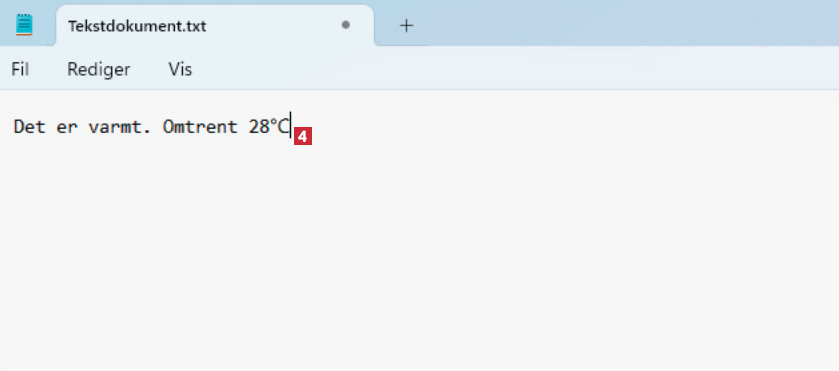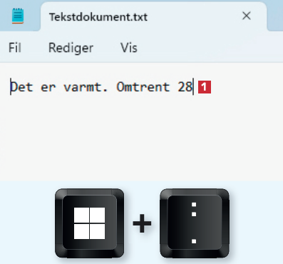 Her mangler vi et tegn i Notisblokk. Sett markøren 1 der teksten skal settes inn. Deretter bruker vi snarveien Windows-tast og punktum.