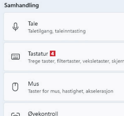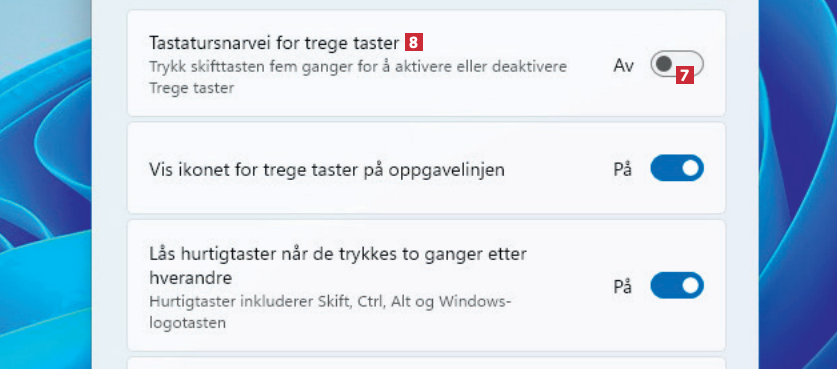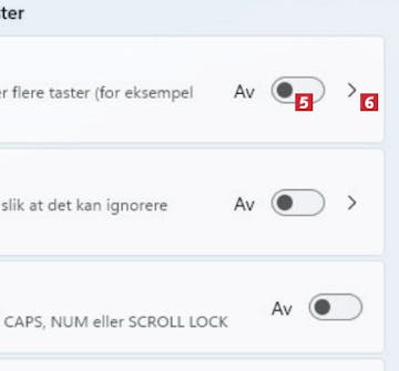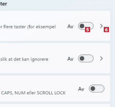 Ved Trege taster slår du av knappen 5. Deretter klikker du på pilen 6. I Windows 10 er det ingen pil, og du går rett til trinn 6.