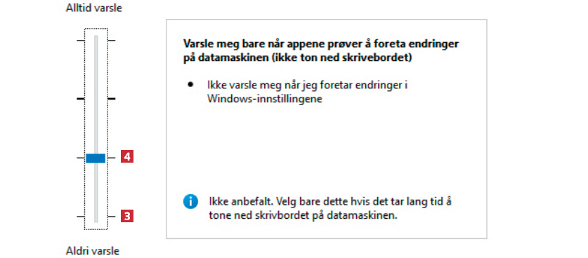 Litt for ofte ber Windows om en bekreftelse når du foretar en endring på pc-en. Da kan du sette den såkalte Brukerkontokontrollen til et lavere sikkerhetsnivå, slik at du ikke forstyrres like ofte.