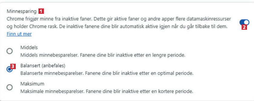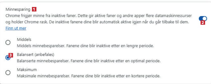 Gå til Chrome-innstillingene ved å skrive chrome://settings/performance i adressefeltet. Trykk på Enter. Gå til kategorien Minnesparing 1, og slå på innstillingen 2. Velg Balansert 3.