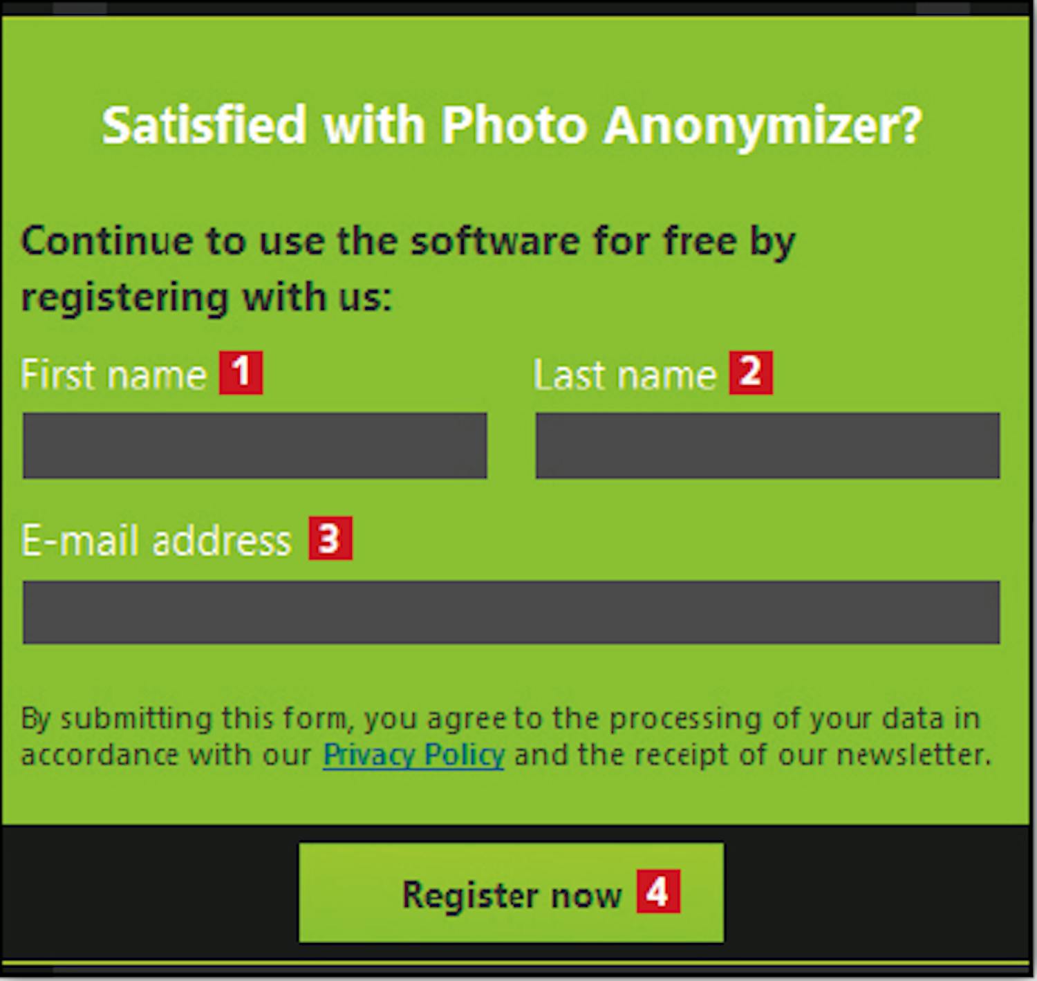 Du må registrere deg hvis du vil bruke fullversjonen av Ascomp Photo Anonymizer. Start med å laste ned og installere programmet fra Fordelssonen, og registrer deg som vist her.