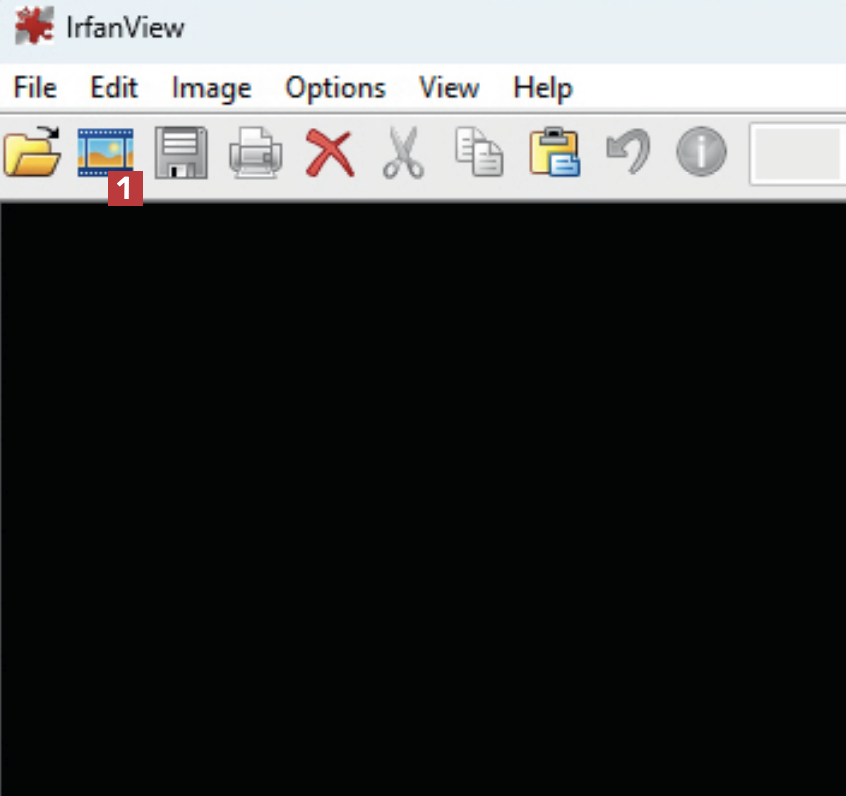 Først må du laste ned og installere IrfanView fra nettsiden vår. Deretter åpner du programmet og klikker på filmremsen 1 i verktøylinjen øverst i programvinduet.