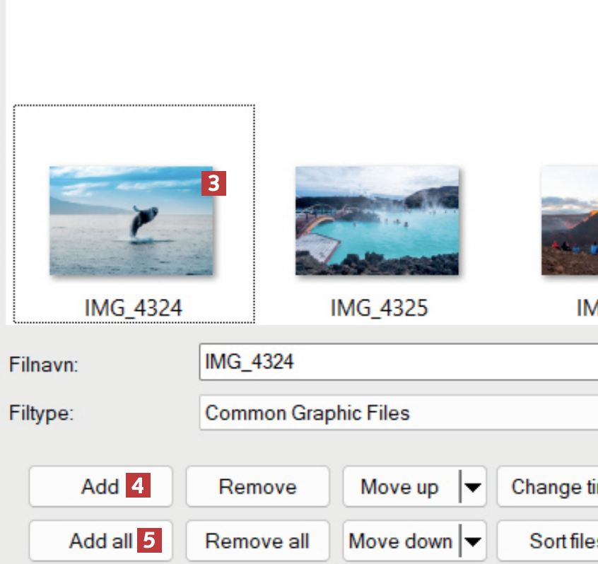 Du kan legge inn bilder enkeltvis ved å klikke på bildet 3 og velge Add 4. I dette eksempelet legger vi inn alle bildene i mappen ved å klikke på Add all 5.