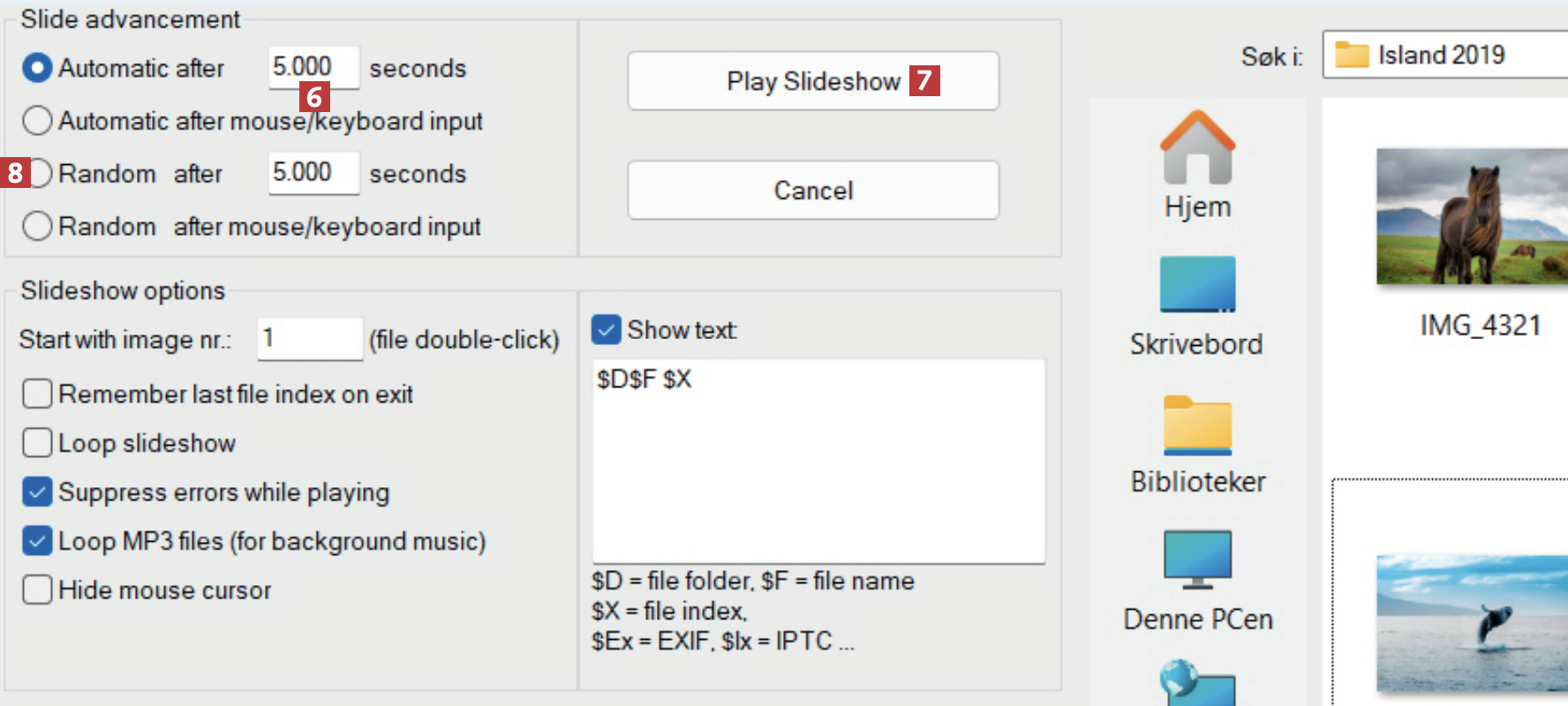 I venstre hjørne velger du hvor mange sekunder 6 et bilde skal vises før det skifter til neste. Når du er klar til å starte visningen, klikker du på Play Slideshow 7. Bildene vises da i alfabetisk rekkefølge. Du kan også velge å se dem i tilfeldig rekkefølge ved å markere Random 8 før du starter visningen.