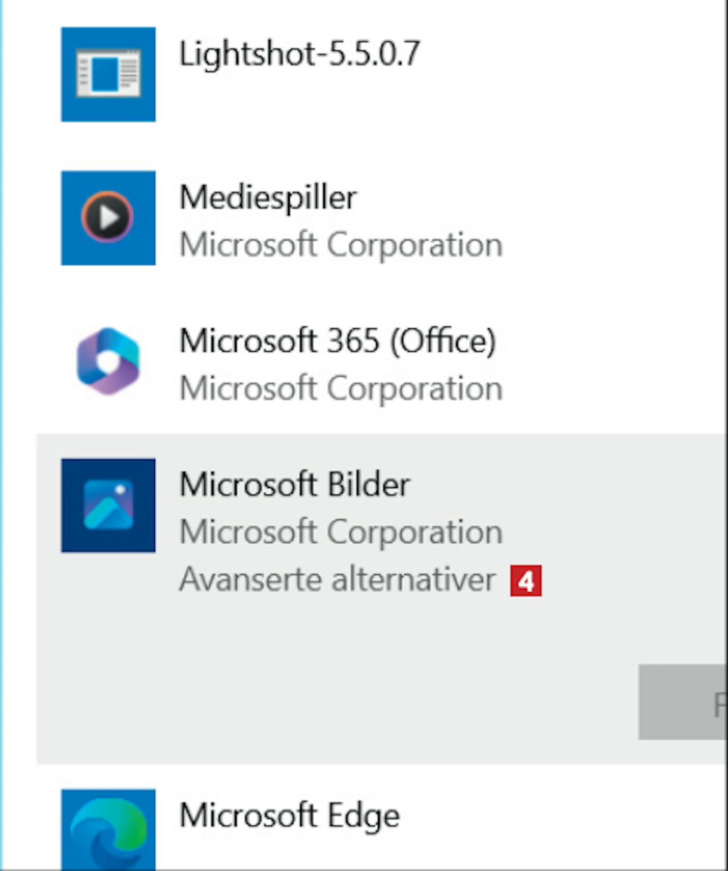 Bla nedover til du finner appen Microsoft Bilder 3 . Klikk på den. I Windows 11 skal du i stedet klikke på de tre prikkene ved navnet på appen.