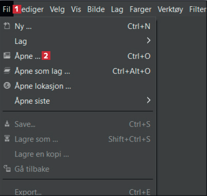 Først må du laste ned og installere Gimp fra nettsiden vår. Åpne programmet, og klikk på Fil 1. Velg Åpne 2 fra menyen.