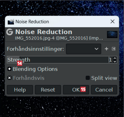 Klikk på skyveknappen ved Strength, hold museknappen nede og dra til venstre omtrent til dette punktet 14. Klikk på OK 15, så er bildet ferdig