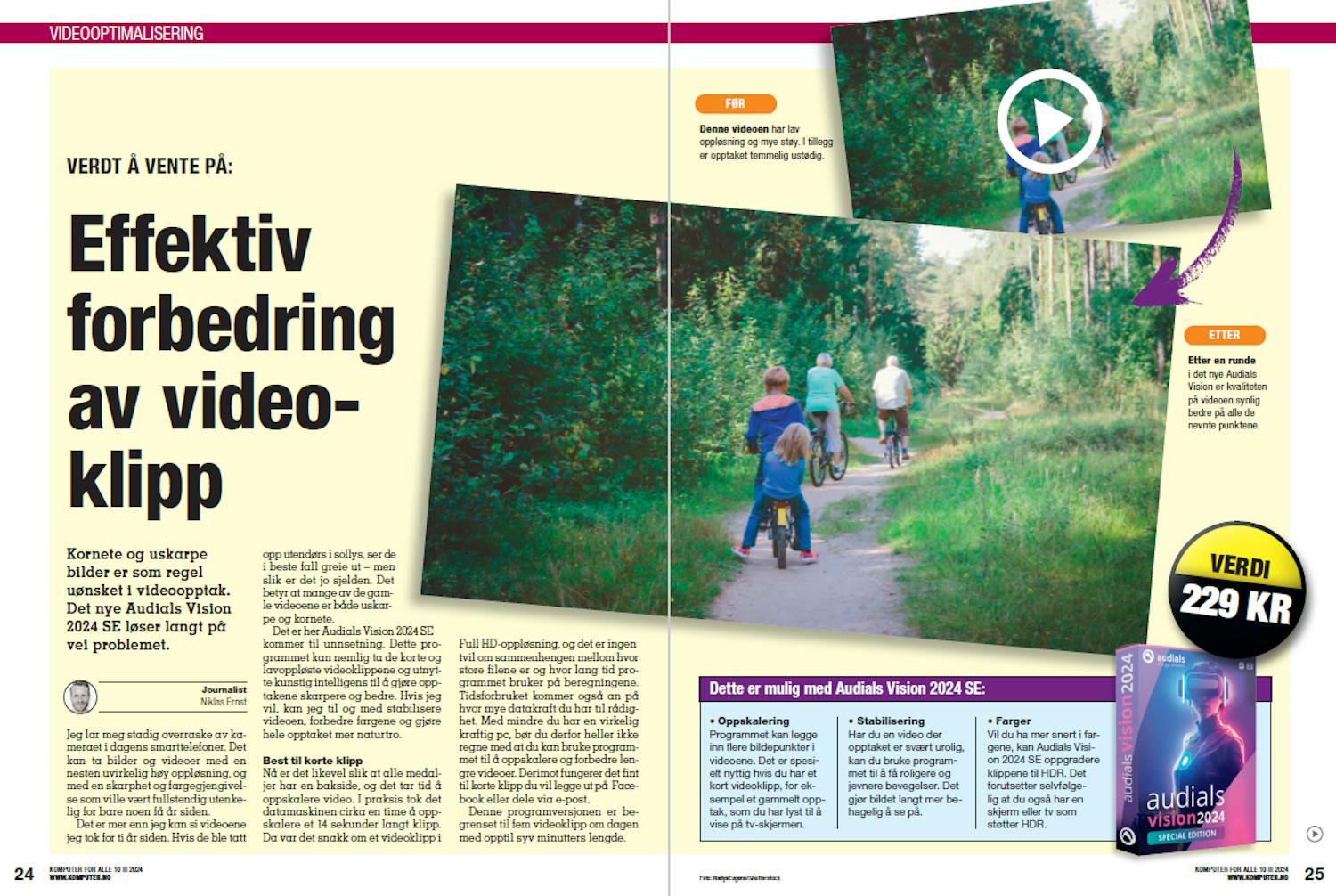 Det er her Audials Vision 2024 SE kommer til unnsetning. Dette programmet kan nemlig ta de korte og lavoppløste videoklippene og utnytte kunstig intelligens til å gjøre opptakene skarpere og bedre. Hvis jeg vil, kan jeg til og med stabilisere videoen, forbedre fargene og gjøre hele opptaket mer naturtro.