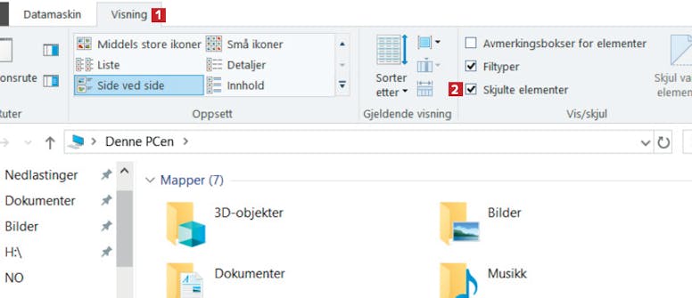 Først kobler du til en minnepinne. Gå til Filutforsker, og velg Visning 1. Sett hake ved Skjulte elementer 2.