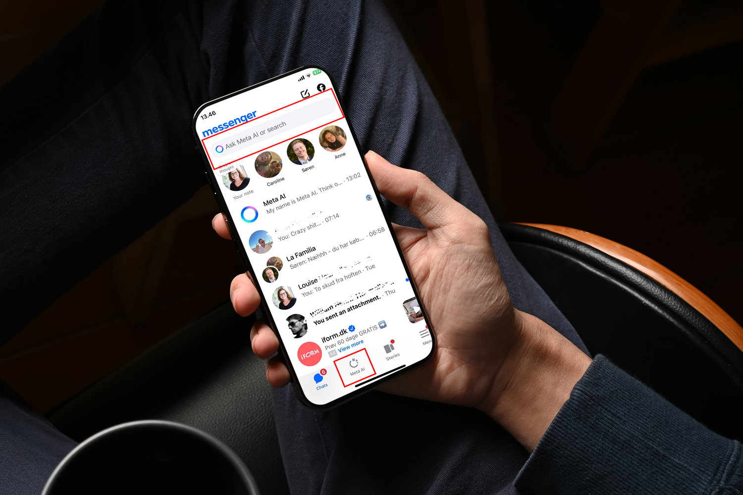 Når du åpner Messenger-appen på mobilen, finner du en ny knapp nederst på skjermen. Den heter Meta AI og er nå lagt til i Messenger-appen for samtlige Messenger-brukere.