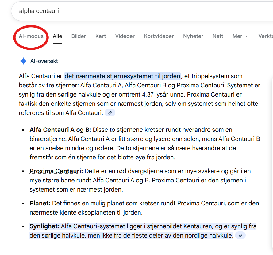 Under søkeresultatene i AI-modus vises nemlig et søkefelt der du kan stille oppfølgingsspørsmål. I eksempelet om stjernen Alpha Centauri kan vi spørre: «Hvor langt unna er den?», så vil søkemotoren forstå ut fra sammenhengen at det er stjernen vi spør om.