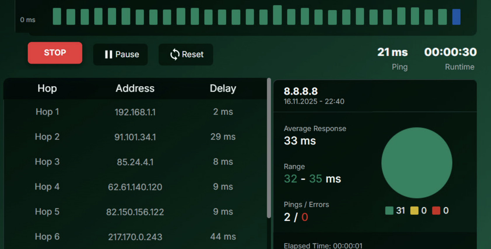 Nå sendes data frem og tilbake til forskjellige servere på nettet, og du ser på fargene i diagrammet om det oppstår feil 3. Grønn farge viser at alt fungerer som det skal.