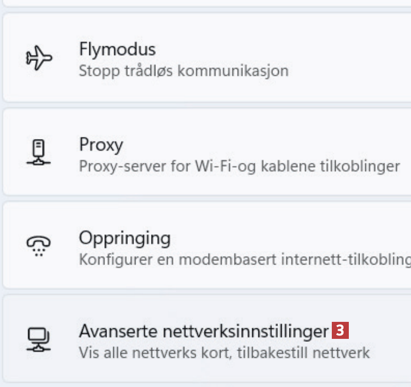 Klikk på Nettverk og internett i menyen til venstre, og velg Avanserte nettverksinnstillinger 3 nederst til høyre.