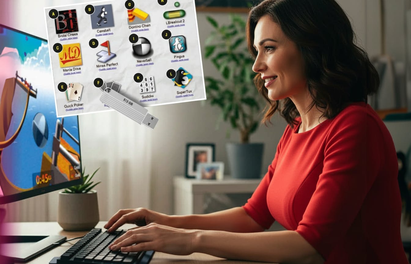 Bare plugg inn minnepinnen i en pc, velg ønsket spill fra menyen og du er klar til å spille. Spillene kjøres rett fra minnepinnen, og du slipper å installere noe som helst. Alt du må gjøre er å konsentrere deg om spillet.