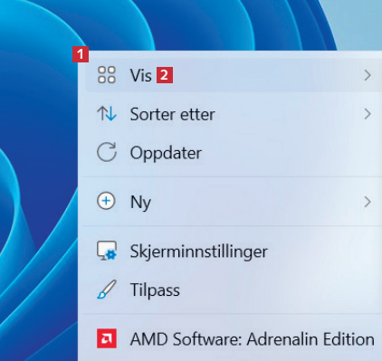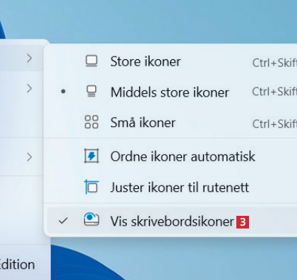 Deretter velger du underpunktet Vis skrivebordsikoner 3, slik at papirkurven og andre ikoner vises på skrivebordet.