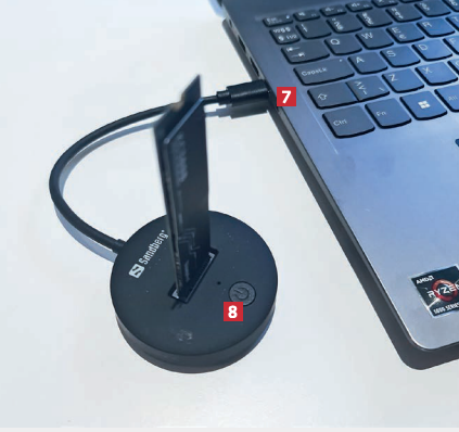Koble NVMe-dokken til en ledig USB-port 7. Har dokken en på/ av-knapp 8, må du også sørge for at den er slått på.