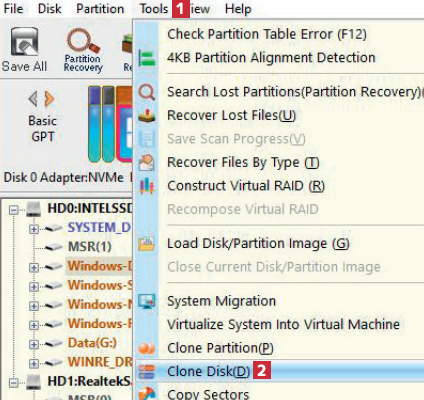 Last ned og installer DiskGenius fra komputer.no. Koble dokken med den nye NVMedisken til pcen, og start DiskGenius. Klikk på Tools 1, og velg Clone Disk 2.