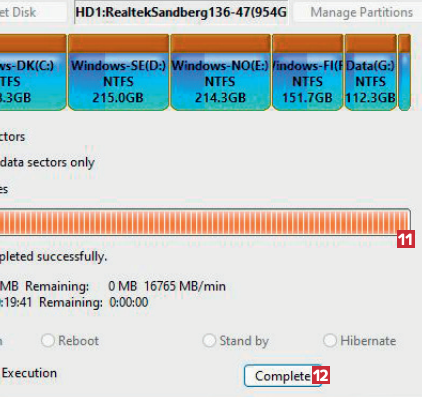 Dra i skyveknappen 9 for å gi den nye Windowsdisken all tilgjengelig plass. Klikk på Start 10 og på OK for å bekrefte. Deretter klikker du på Hot Migration for å klone.