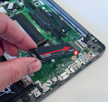 Vipp kortet forsiktig opp 5, og dra det ut av konnektoren 6. På NVMe-disker er det ofte en liten pute 7 som du også skal bruke på den nye enheten du monterer.