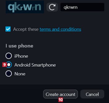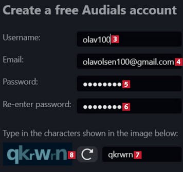 Nå velger du et brukernavn 3, oppgir e-postadressen din 4 og angir et passord 5 som du gjentar 6. Så skriver du tegnene 7 fra feltet 8.