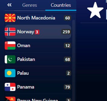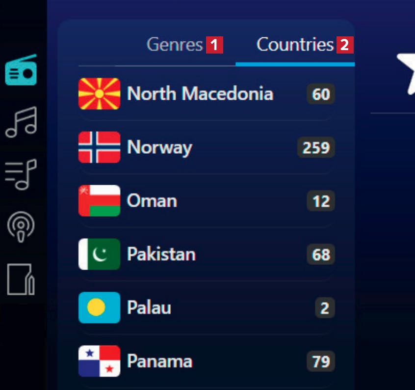For å finne kanaler kan du for eksempel sortere dem etter Genres 1. Vi velger i stedet Countries 2 for å finne norske kanaler.