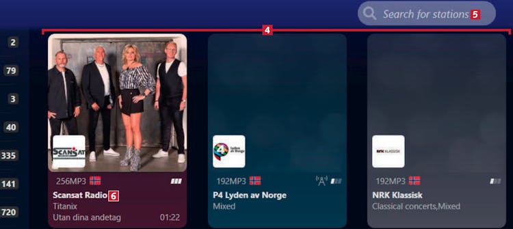 De norske kanalene vises i oversikten i midten 4. Vær klar over at du også kan søke etter bestemte stasjoner 5. Dobbeltklikk på en stasjon 6 for å lytte.
