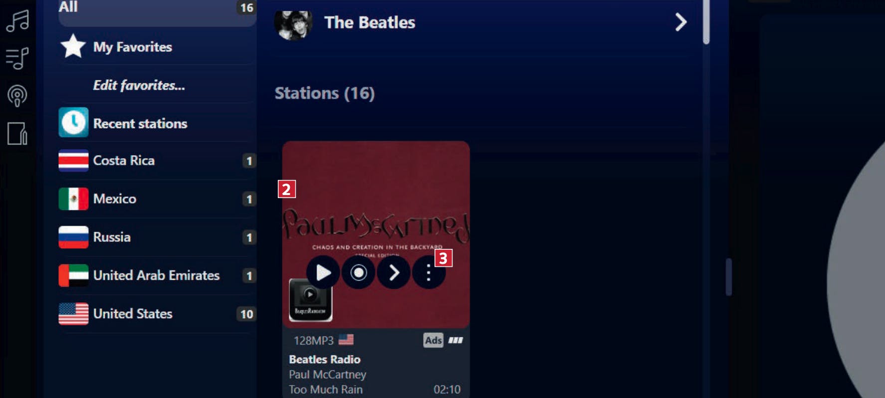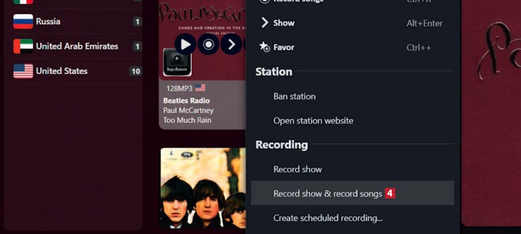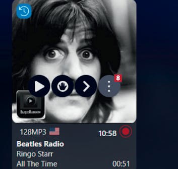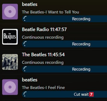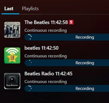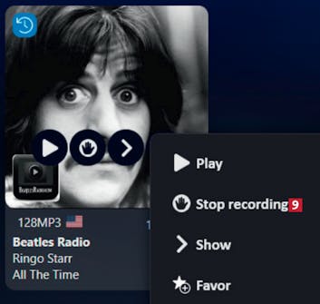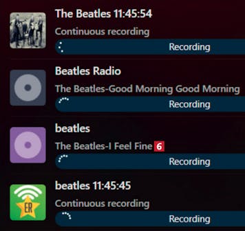 Panelet til høyre viser opptak av radioprogrammene 5 (i dette tilfellet tre kanaler som spesialiserer seg på The Beatles). Lytt ved å markere en kanal og trykke på mellomromstasten.
