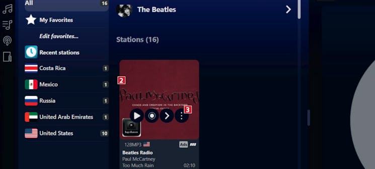 Oversikten viser radiokanaler som spiller musikk av den valgte artisten. Før musepekeren over en radiokanal i listen 2. Klikk på de tre prikkene 3.