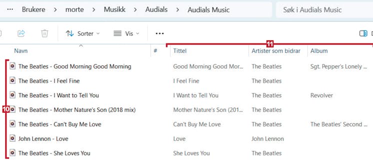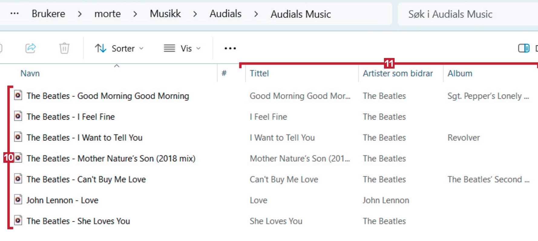 Du kan lytte til musikken du har tatt opp i programmet, men du får bedre oversikt i Filutforsker. Gå til mappen C:\Users\xxxx\Music\Audials\Audials Music (erstatt xxxx med brukernavnet i Windows). I den finner du sporene som MP3-filer 10. Du ser også informasjon om musikken 11. Låtene er klippet slik at programledernes eventuelle prat før og etter musikken er fjernet.