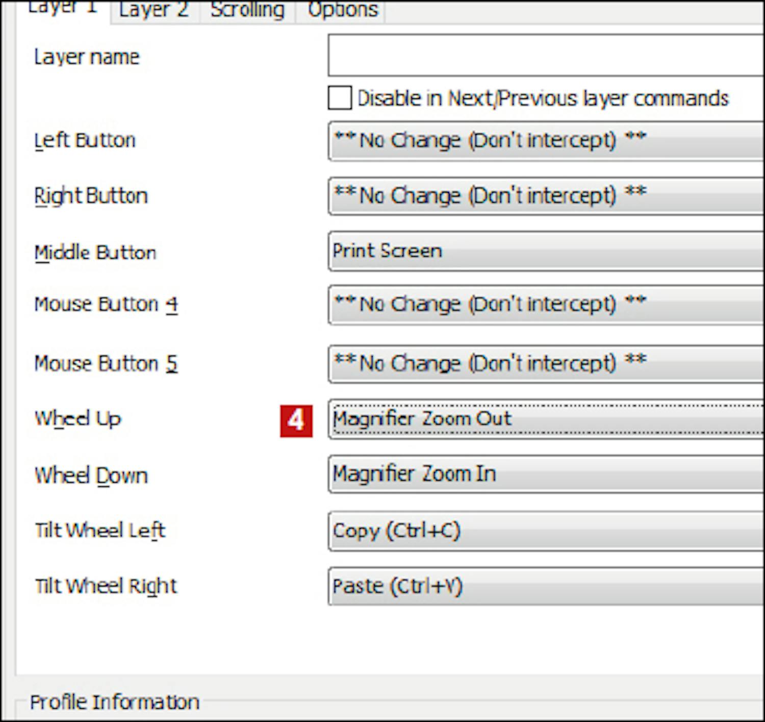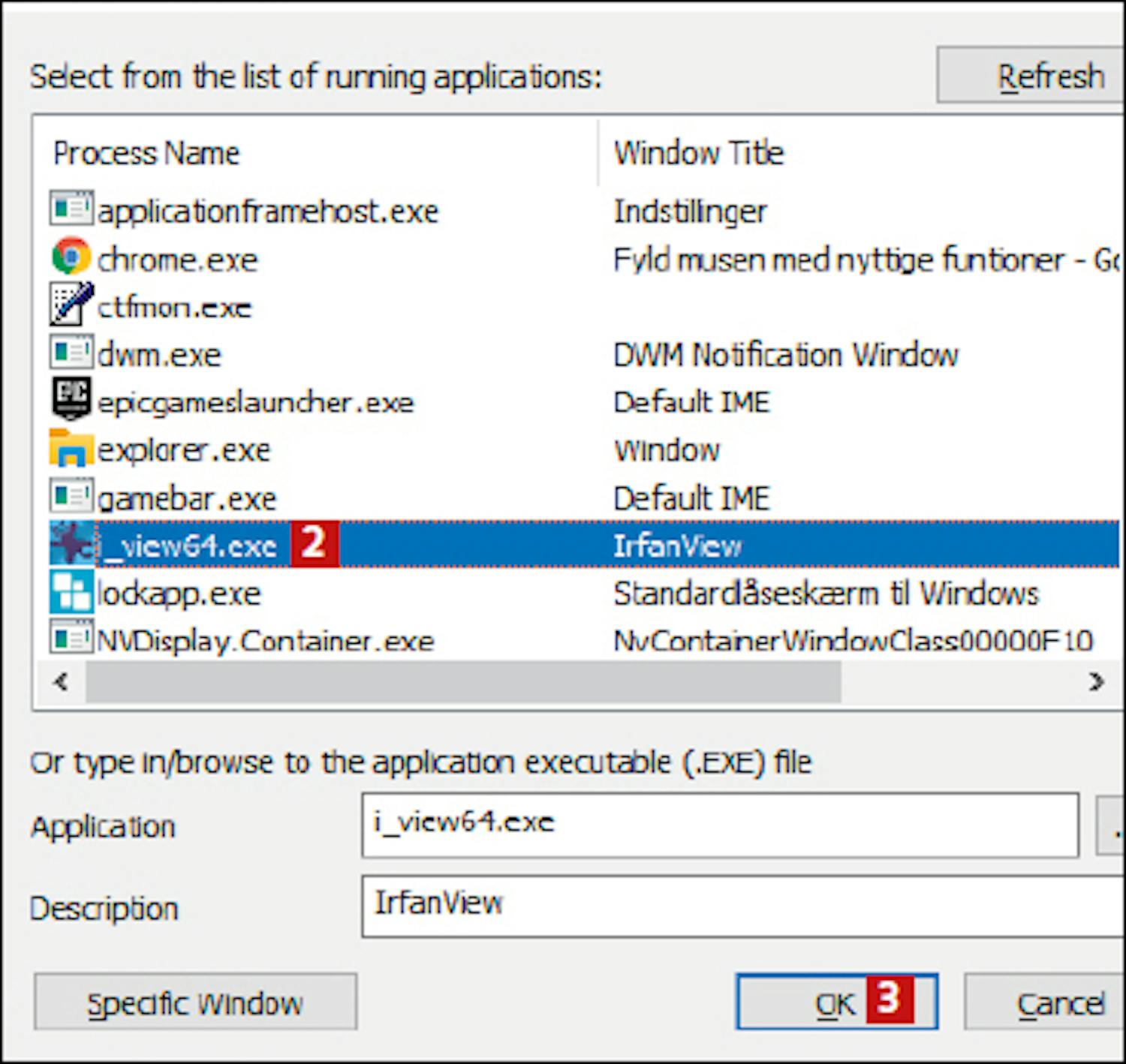 Her viser vi et konkret eksempel på hvordan du bruker X-Mouse Button Control. Vi vil at museknappene skal optimaliseres for bildebehandlingsprogrammet IrfanView. I den gule boksen nederst til høyre viser vi noen av de nyttige funksjonene du kan velge i nedtrekksmenyene.