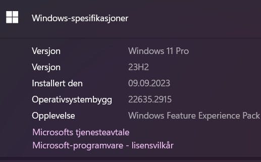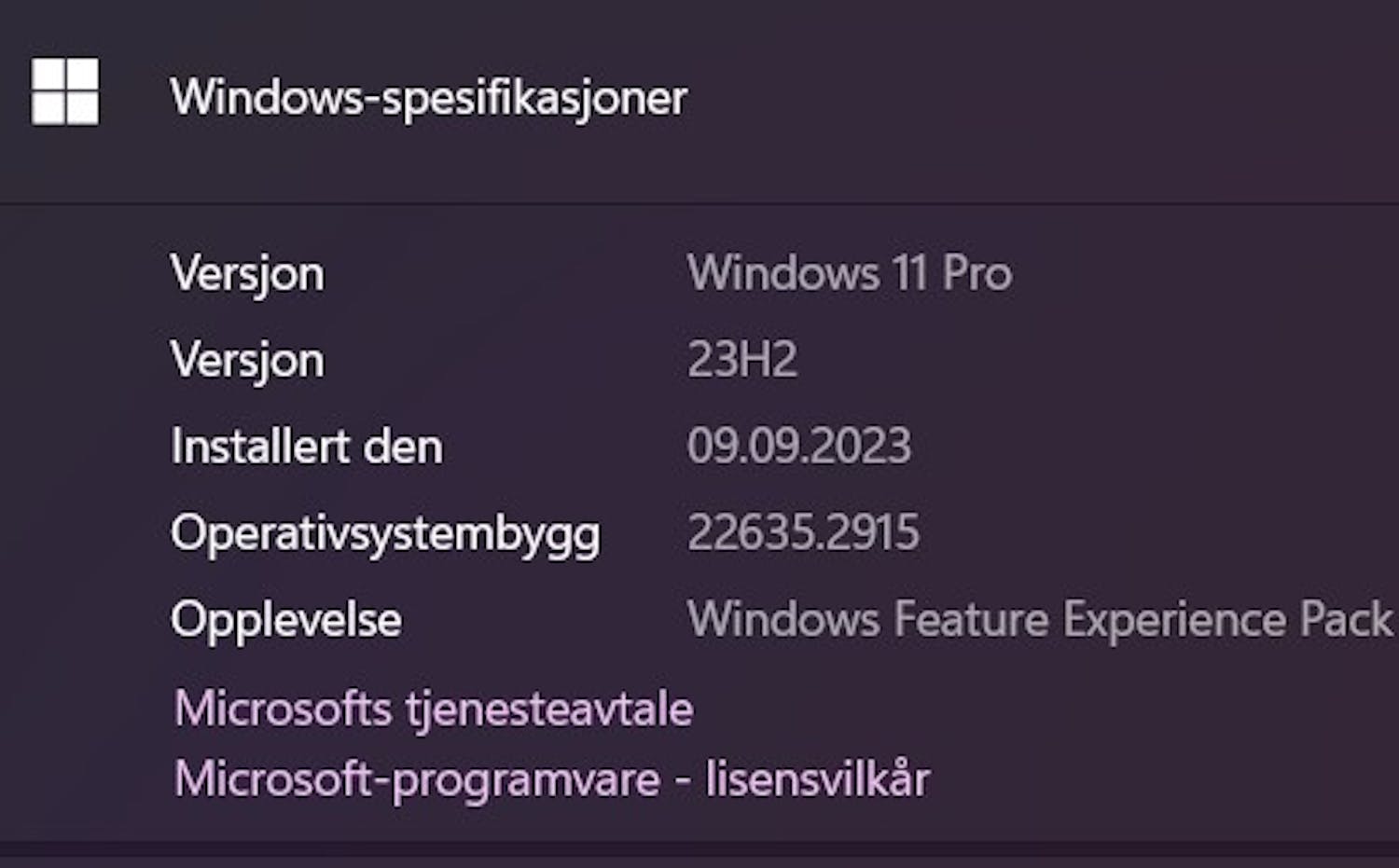 I det norske operativsystemet omtales altså både Utgave (som "Windows 11 Pro") og Versjon (som "23H2") som "Versjon". Det kan virke forvirrende, men slik er det.