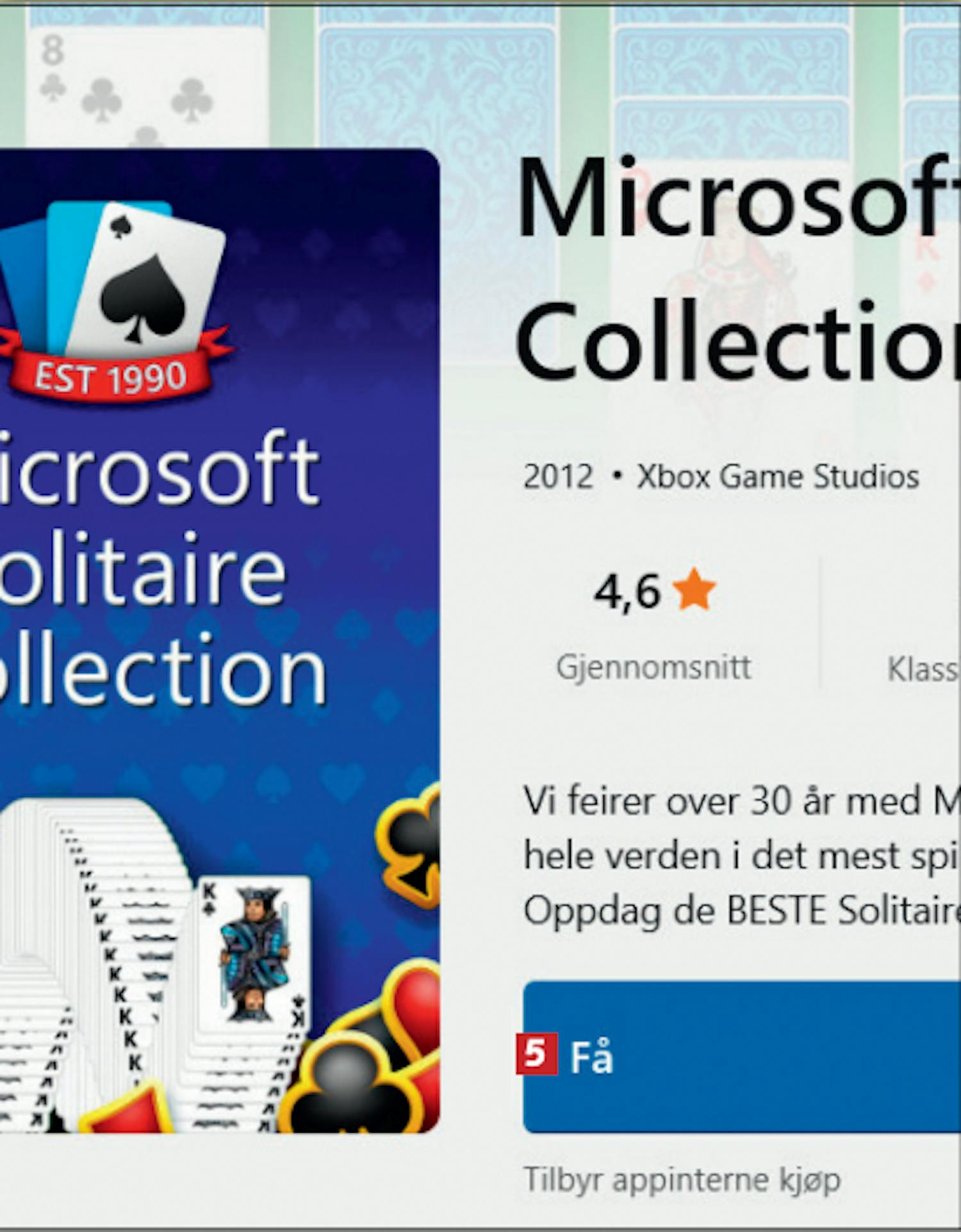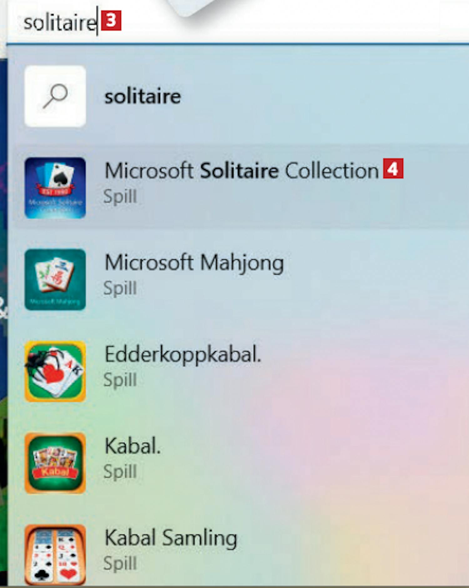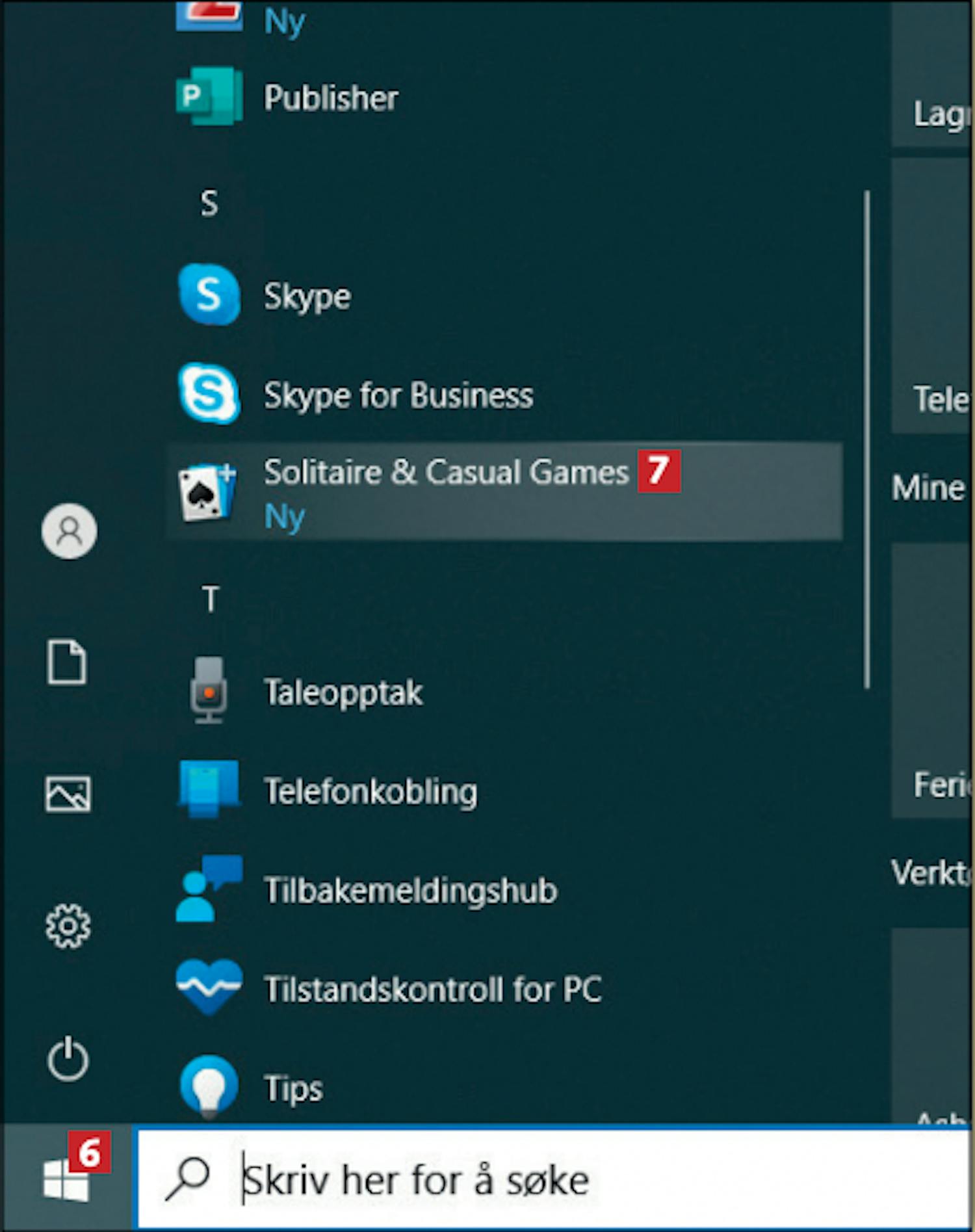 Heretter finner du spillet ved å åpne startmenyen 6 og velge Solitaire & Casual Games 7 .