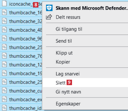 Åpne Filutforsker. Velg Vis fulgt av Vis/skjul 1 (i Windows 11 klikker du på Vis og Vis igjen). Marker feltet 2 ved Skjulte elementer.