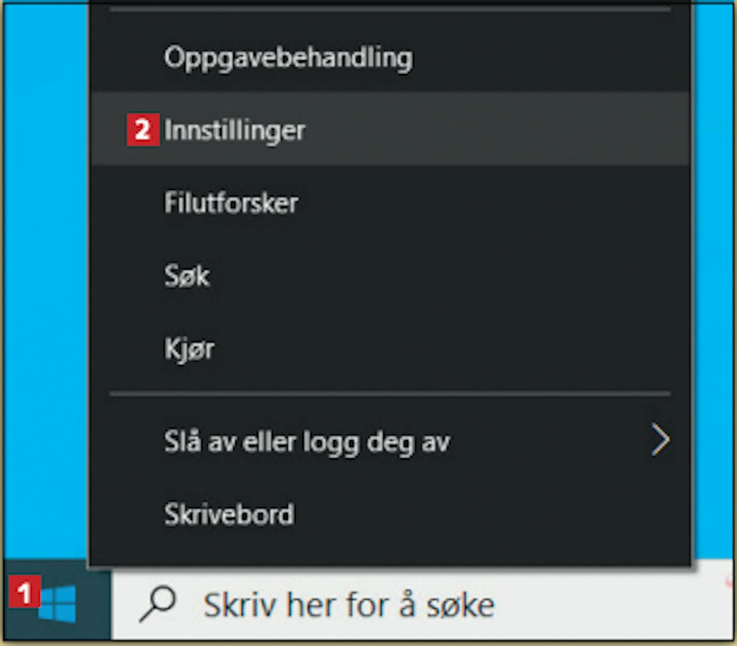 Høyreklikk på startknappen 1 og velg Innstillinger 2 .