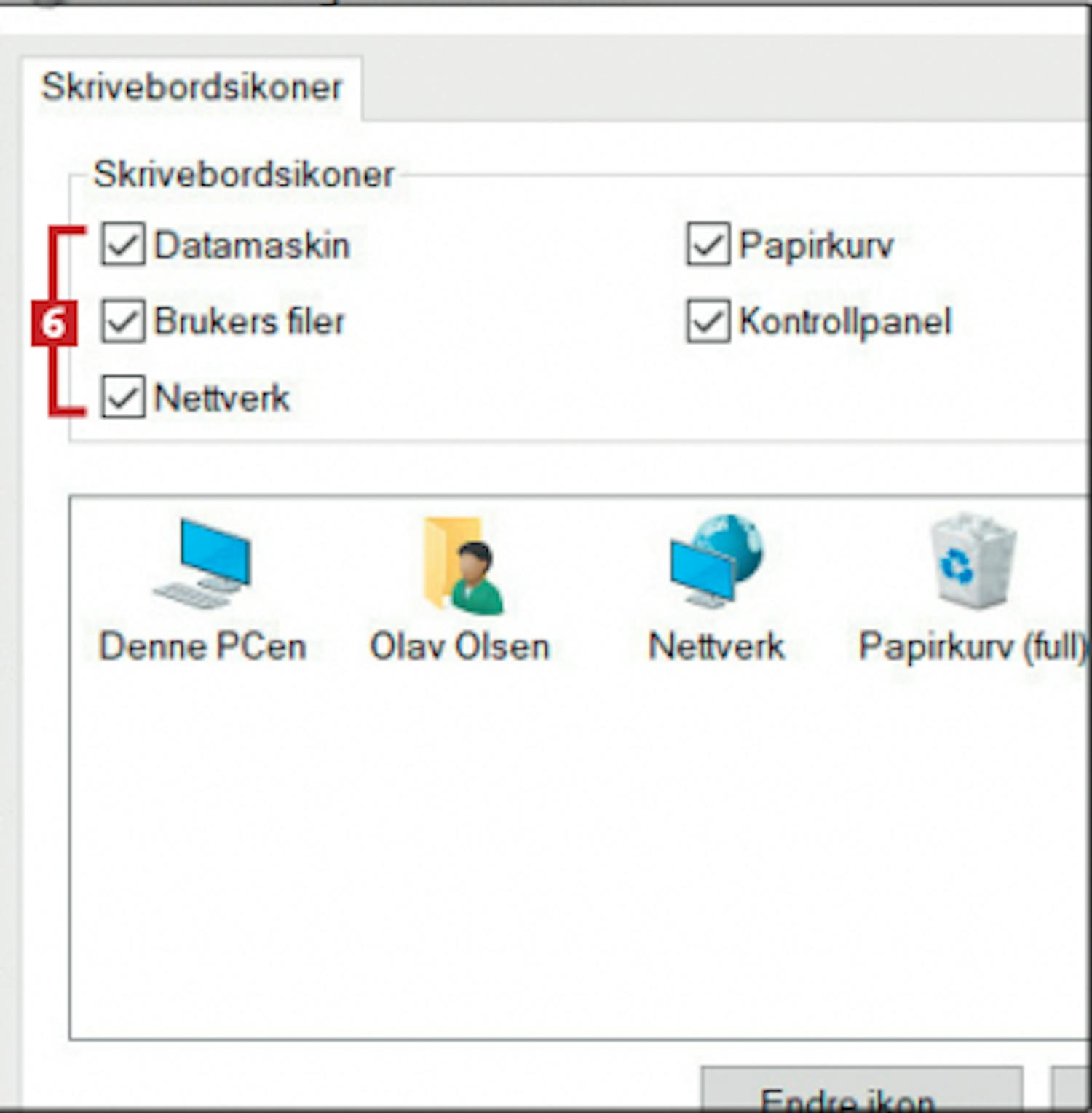 Merk av for ikonene du vil ha på skrivebordet, for eksempel Datamaskin 6 . Klikk på Bruk og OK.