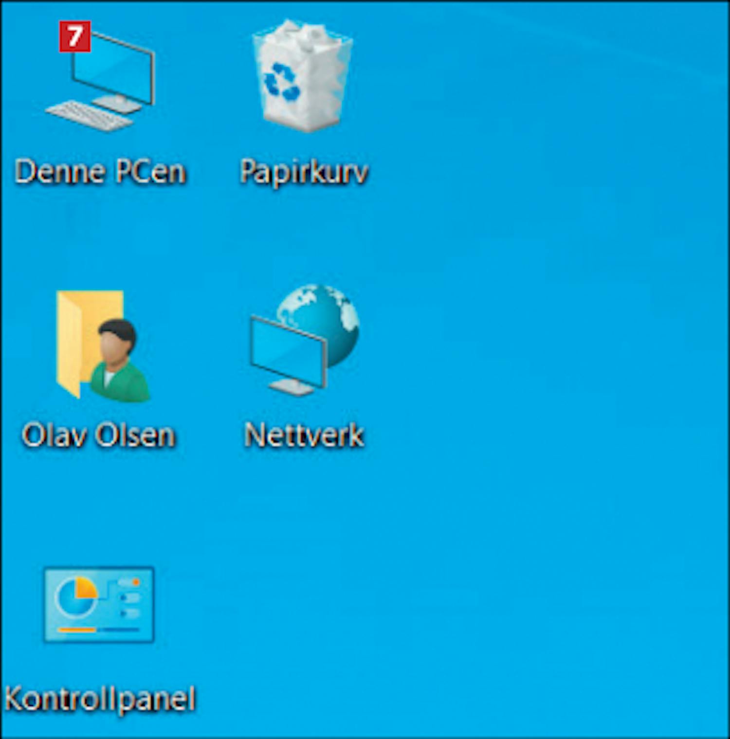 Nå ligger den ekte Denne PC-ensnarveien på skrivebordet. Du kan dra den opp i hjørnet 7 , der den vil bli liggende. Slett den «falske» snarveien med et høyreklikk etterfulgt av Slett.