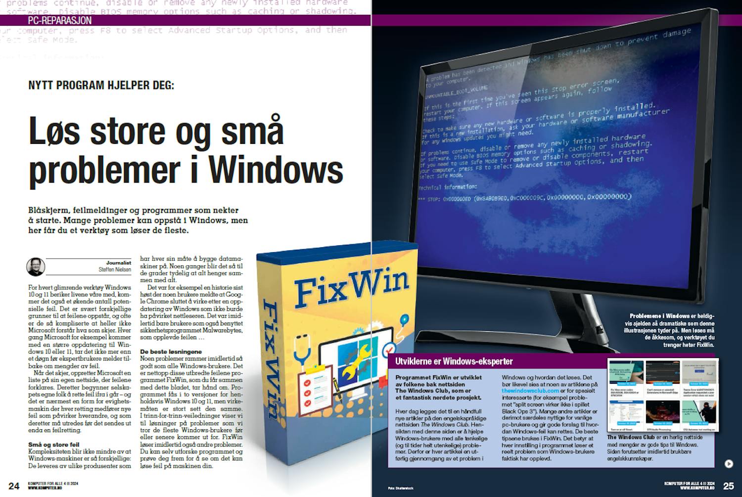 Noen problemer rammer imidlertid så godt som alle Windows-brukere. Det er nettopp disse utbredte feilene programmet FixWin, som du får sammen med dette bladet, tar hånd om. Programmet fås i to versjoner for henholdsvis Windows 10 og 11, men virkemåten er stort sett den samme. I trinn-for-trinn-veiledninger viser vi til løsninger på problemer som vi tror de fleste Windows-brukere før eller senere kommer ut for.