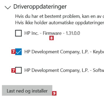 Marker drivere du ønsker å oppdatere 7, men unngå å velge BIOS eller fastvare (eng. firmware) 8, som kan gi tekniske problemer. Klikk på Last ned og installer 9.