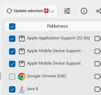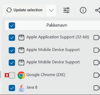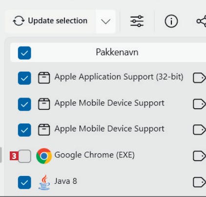 Nå vises en liste med oppdateringer. Hvis du vil beholde en eldre versjon av et program, fjerner du markeringen 3 ved dette.