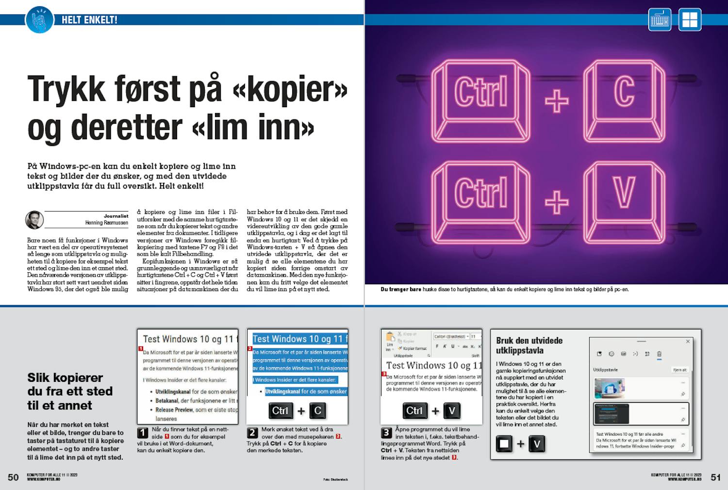 I tidligere versjoner av Windows foregikk filkopiering med tastene F7 og F8 i det som ble kalt Filbehandling. Kopifunksjonen i Windows er så grunnleggende og uunnværlig at når hurtigtastene Ctrl + C og Ctrl + V først sitter i fingrene, oppstår det hele tiden situasjoner på datamaskinen der du har behov for å bruke dem. Først med Windows 10 og 11 er det skjedd en videreutvikling av den gode gamle utklippstavla, og i dag er det lagt til enda en hurtigtast: Ved å trykke på Windows-tasten + V så åpnes den utvidede utklippstavla, der det er mulig å se alle elementene du har kopiert siden forrige omstart av datamaskinen.