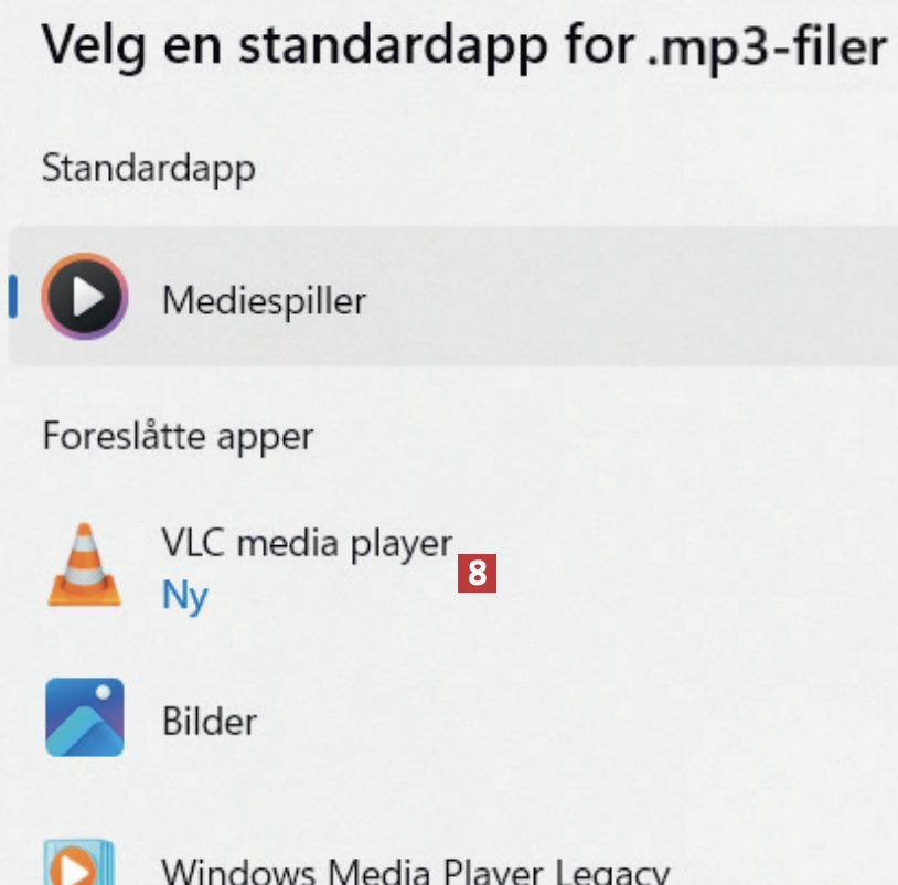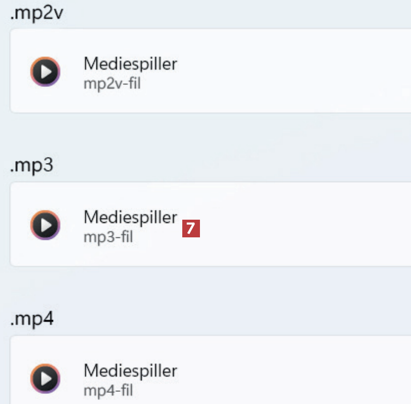 Nå må du gjennomgå filtyper og klikke på den 7 (her .mp3) du vil at programmet skal åpne som standard. Dette må du gjenta for hver filtype du vil programmet skal åpne.