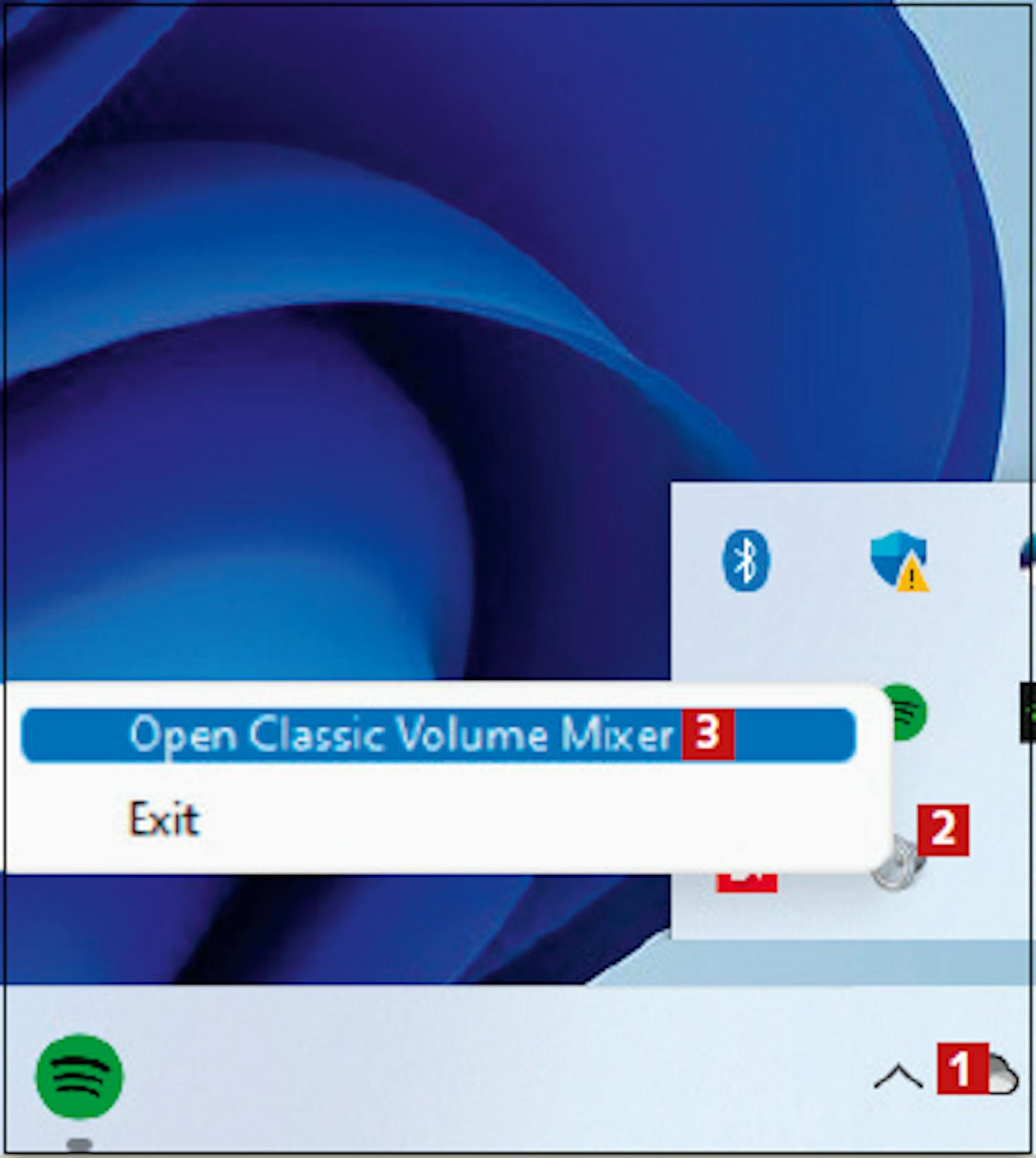 Installer Classic Volume Mixer fra Fordelssonen. Klikk på den lille pilen 1, høyreklikk på ikonet 2 og velg Open Classic Volume Mixer 3.
