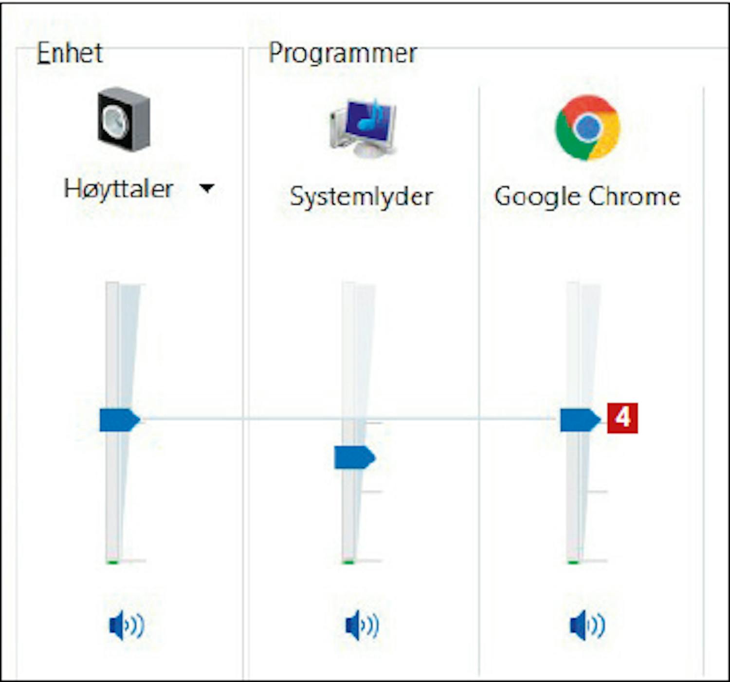 Mikservinduet åpnes. Med skyveknappene velger du volum for hvert program, f.eks. for Chrome 4.