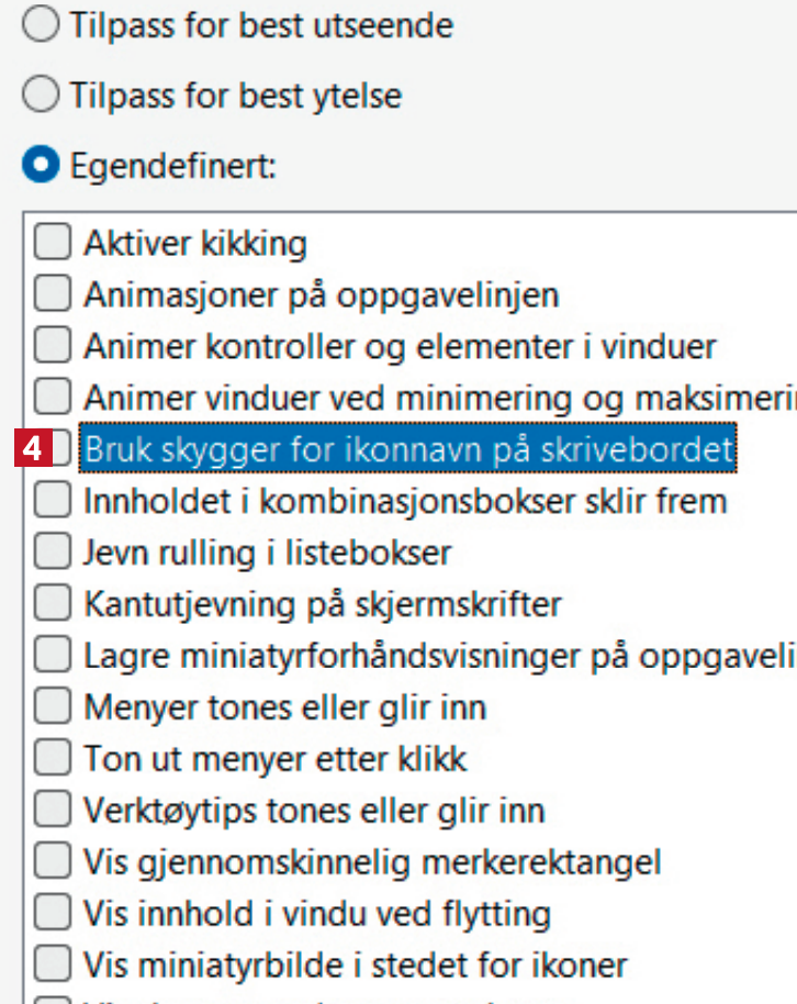 På skrivebordet i Windows 11 er det svake skygger bak ikonene. Det gjør det vanskelig å lese teksten under dem. Derfor vil jeg fjerne dem, men finner ingen innstilling i Windows der det er et alternativ. Er det i det hele tatt mulig å bli kvitt disse skyggene?