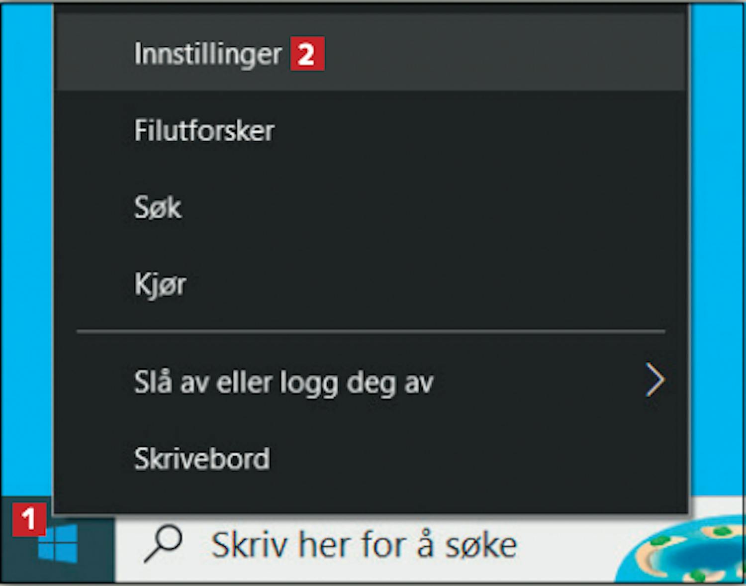 Først høyreklikker du på startknappen 1 . Deretter klikker du på menypunktet Innstillinger 2